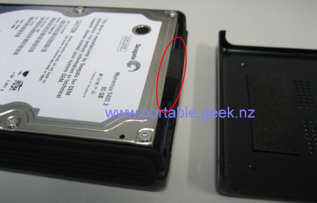 Opening this back cover reveals the hard disk which is held in place by a sponge. A good design to prevent the hard disk from moving around when jogging, etc.
