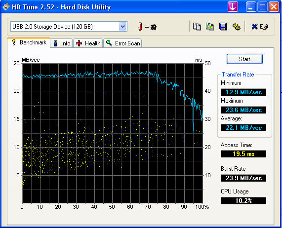 2.5" Hitachi 4k120 4200rpm 120GB Hard disk benchmark in a USB 2.0 portable hard disk case (Soloman 632AW)