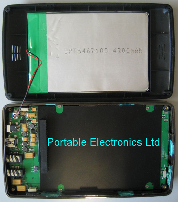 This PMP features a removable battery design. The battery is located on the back cover and can be easily replaced by pulling the back cover off and putting another back cover on. If one pulls the back cover off, you can see the battery clearly located on the center of the back cover with two speakers at the side. The hard disk used on this PMP is the same as 2.5" hard disk found in laptop computers and can be easily replaced/upgraded by users by pulling this back cover off and swapping in a new one. Two good things I like about this back cover is that there is no wires attached to the back cover so there is not fear that pulling the back cover off might also break the battery wire ;), in addition, you don't need a screw driver to open the back cover to change a battery or replace the hard disk!!!! No screws to lose :) Nice.